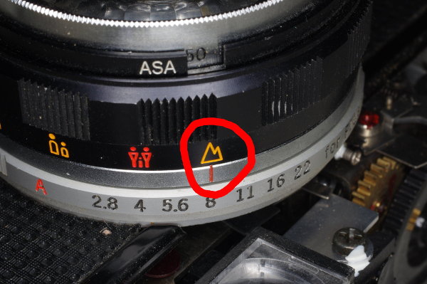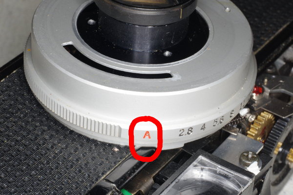 | To ensure that the f-stop ring engages the f-stop pin correctly, place it on the body with red “A” in the position shown. |