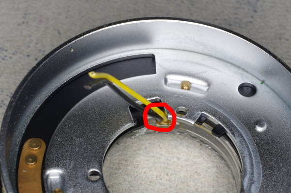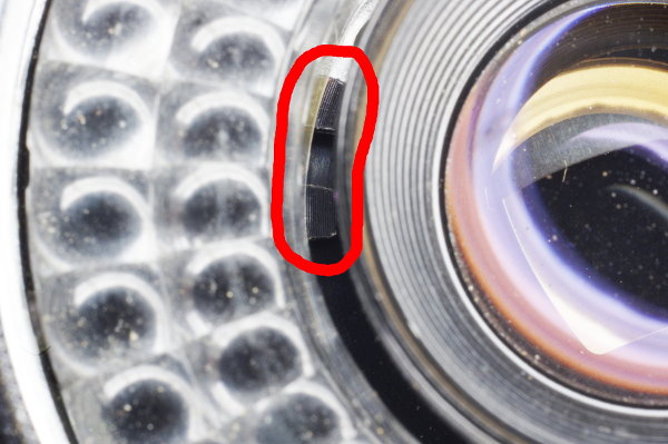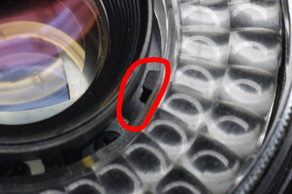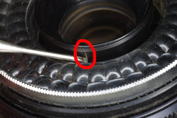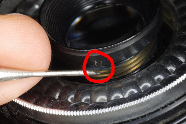 | The inner focus-ring has a pin (circled in red) which mates with a claw on the body. If these are misaligned, you won’t be able to focus. |
