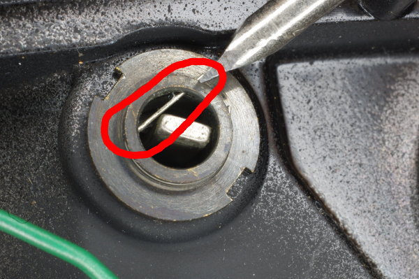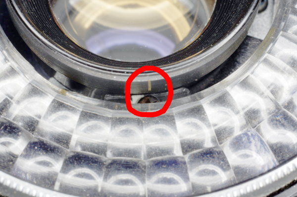 | Mark the position of the lens by making a scratch as shown with the tip of a screwdriver aligned with a screw underneath. There might already be a scratch on this part from the factory. If so, check to see what it’s aligned with. |