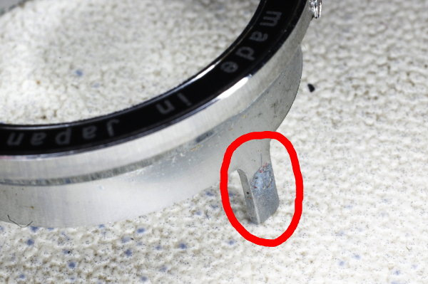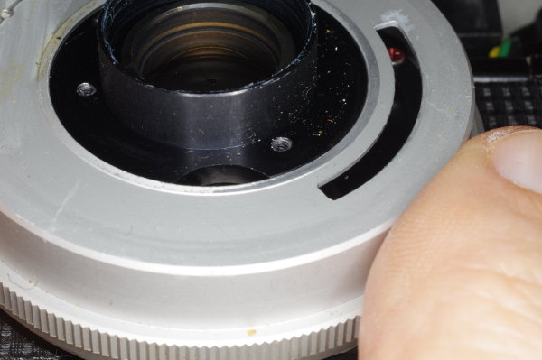 | Here’s another view of the claw. Focus the lens at infinity by aligning the scratch with the screwhead. Carefully place the ring on the lens without rotating the lens. I suggest pressing a swab against the lens to block it as described earlier while manipulating the ring into place. |