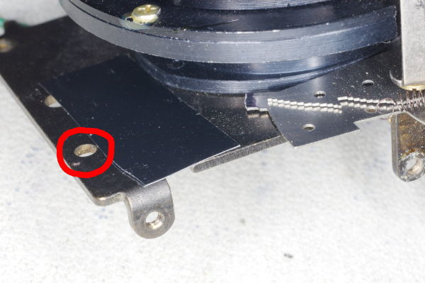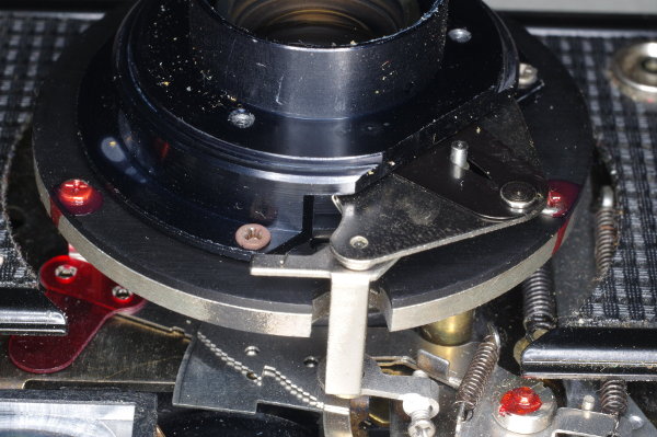 | The spring has been installed, and is pulling the aperture into its wide-open position. Pushing down on the screwhead (at the right end of the spring) should close the aperture. This is a variant 2 mechanism. |