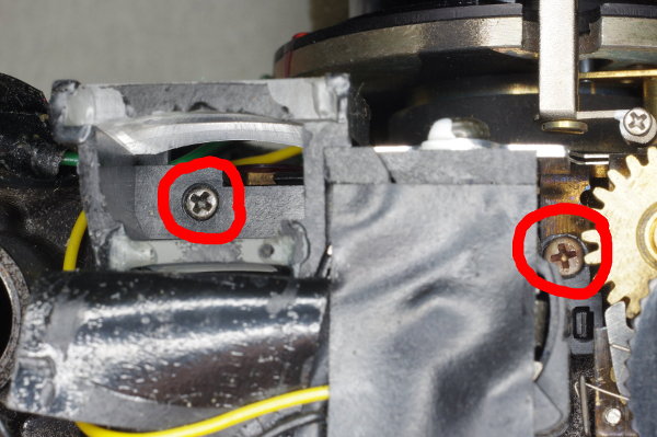| Here are the other two screws on the right side of the shutter-plate. Remove them, and pull the shutter-assembly up and out of the body. |