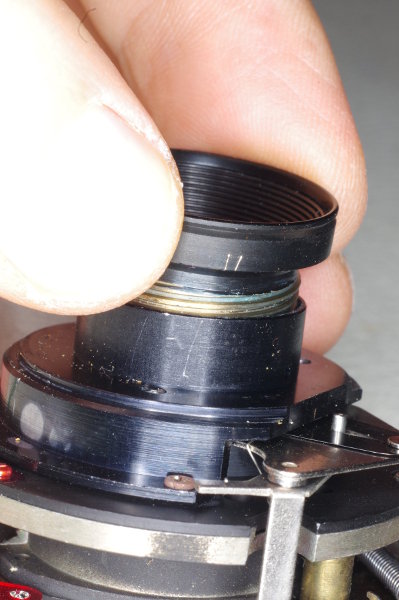 | Rotate the lens until it just comes free. Then put two scratches on it by the same screwhead. The threads for the lens can enter at two positions; i.e., these threads have two starts or entries. On reassembly, you need to begin threading at the correct starting position. |