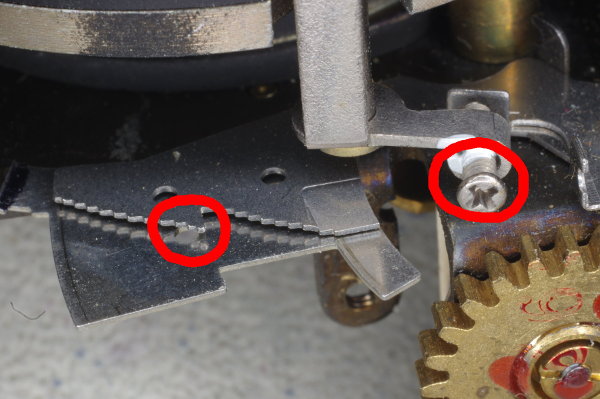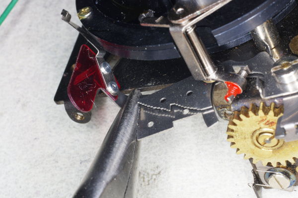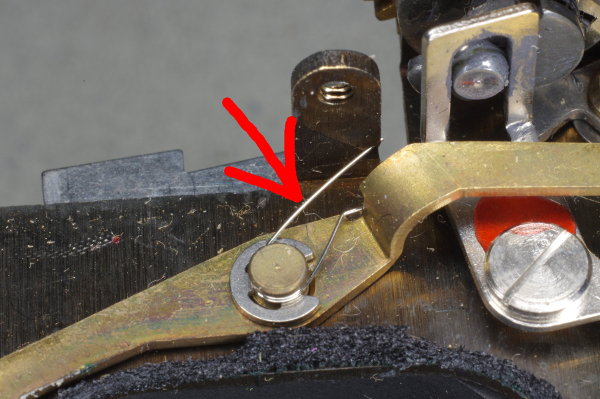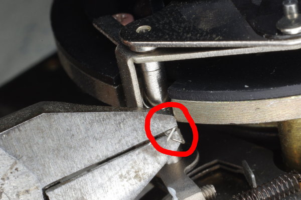 | Using tweezers, hook the ends of that tiny spring into the hole on the left and the screw on the right. As you saw, this spring is tiny, and it’s easy for it to slip while attempting to install it, causing it to fly away, never to be seen again. Keep a finger on one end of the spring while manipulating the other end with your tweezers. I suggest installing the left end first (onto the lever), as that is more difficult than hooking it over the screwhead, and this chore is easier when the spring is not under tension. |