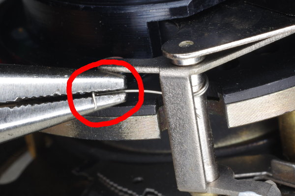 | Grab the other end of the hairspring with needle-nose pliars as shown, and pull it out. Don’t pull hard, or you might damage the surrounding aperture mechanism. |