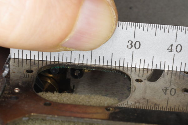 This is the low-speed position, and the bottom of the wire will rest on the floor of the casting. You can see where I drew a mark for the floor along the bottom of the large shutter-plate. The right end of the speed-lever is perfectly positioned. |