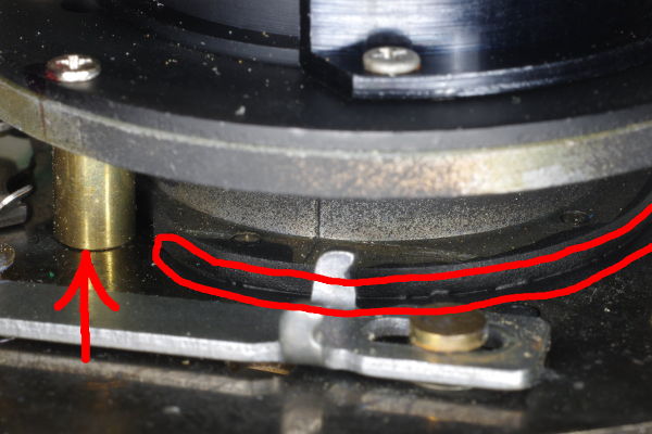 | You won’t get the plate perfectly flat, and to avoid having light sneak past the shutter-tube after you attach it with those four screws, I suggest applying black paint to the junction of the tube and plate as shown by the long curved red lines in this photo. The paint will fill the gaps. But don’t paint near the brass rod on the left (red arrow), because it needs to rotate freely, and paint will jam it. Instead, apply black paint to the inside of the tube in the area near the rod. |