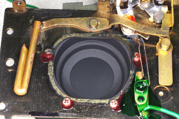 | In the variant 1 design, the shutter-plate has a long slot located just below the viewfinder, as shown in this photo. Light spilling down from the viewfinder can enter this slot, where it can do no good. |