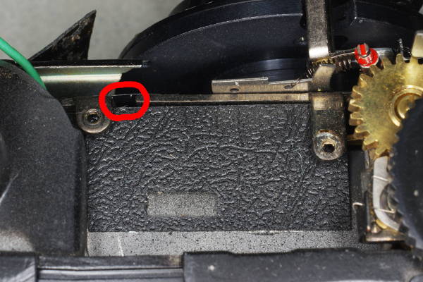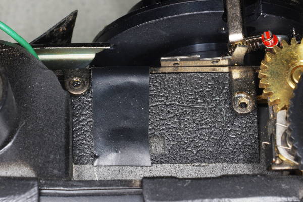 | This top view shows two openings into the body’s interior. The viewfinder will occupy this area (note the two threaded tabs), which means that sunlight can pass through the viewfinder and into these openings, stressing the degraded light-seal foam that you saw earlier, risking a light-leak. I suggest blocking these openings as explained below. |