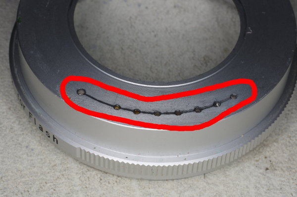 | A tiny ball will be in the back of this assembly as shown, or it might be on the aperture-ring on the camera. Remove this ball. Actually, I prefer to leave it on the ring-assembly as shown, but secured with a small dab of grease. |