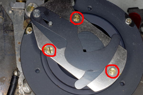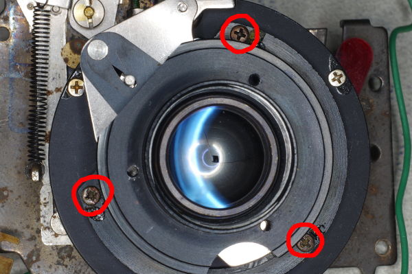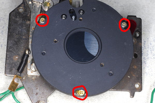 But if you’re comfortable working with small parts, or if you need to clean the shutter blades, then remove the three screws circled in red, and pull off the aperture assembly. |