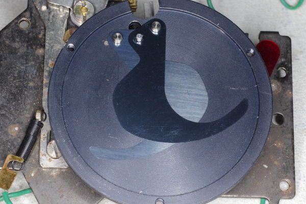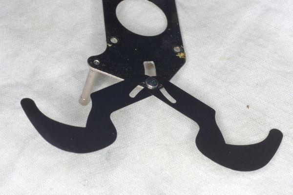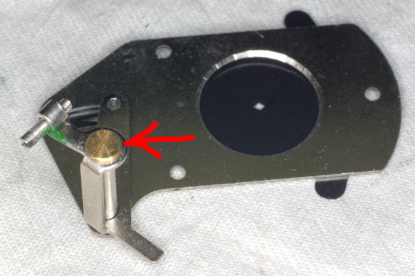 | Turn the assembly upside-down as in this photo, and remove the brass screw (red arrow). There is also a hairspring on the shaft (not pictured); note where it hooks the the mechanism, and unhook one end before pulling this lever off the shaft. |