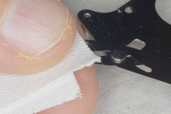 I have found that it’s best to clean blades using the sandwitch technique described above. Since these blades are unattached, pull a blade out of the sandwitch using tweezers. Remember to wipe the upper and lower shutter plates with a damp cloth in case there’s any oil on them. The shutter blades rub these metal surfaces, and thus might pick up oil that’s on them. |