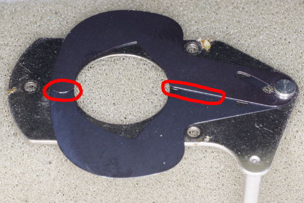| When reassembling the aperture assembly, take care to ensure that the blade that is on the top of the hinge is also on top at its tail (left red circle). And be careful that the hairspring is put back correctly. However, if you plan to make the manual-speed modification, leave the hairspring out. |