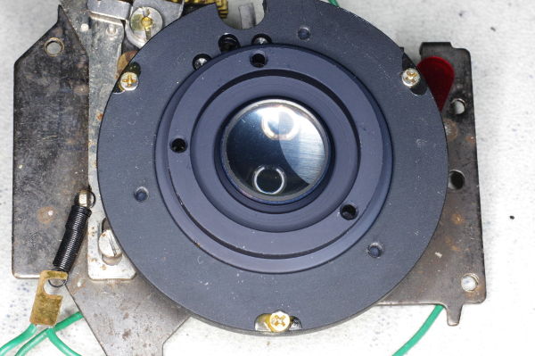 | Rotate the lens until it just comes free. Then put two scratches on it by the same screwhead. The threads for the lens can enter at two positions; i.e., these threads have two starts or entries. On reassembly, you need to begin threading at the correct starting position. |