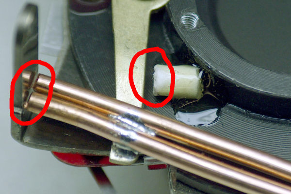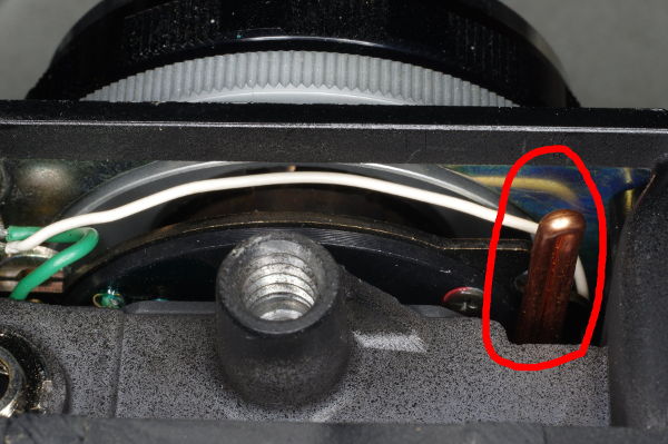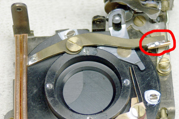 The problem we face is how to limit the travel of the speed-lever in both directions. In this photo, I solved these two problems as follows: (1) I positioned the wire so it will hit the viewfinder support tab on the left (left red circle). This is partly why the wire is longer than the Trip's 24mm wire. (2) I glued a small bit of material (right red circle) onto the plate to limit downward motion. |