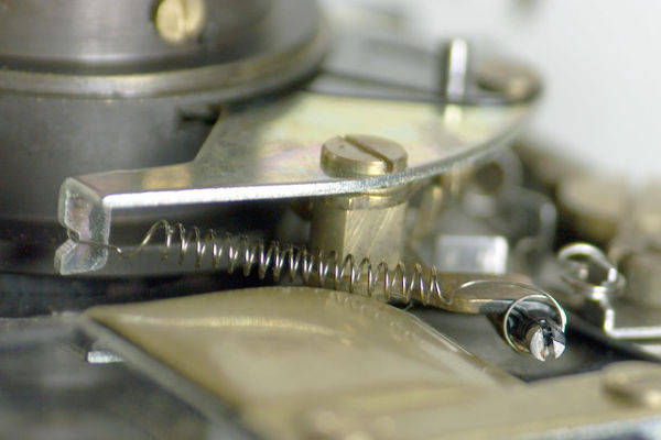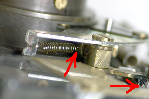 | Here's some good news: The spring to hold the aperture open is easier to move than with the Trip. There's already a coil spring holding the aperture closed. You will grab the right end of it (left red arrow) with a needle nose pliars and hook it to the aperture-calibration screw (right red arrow). |