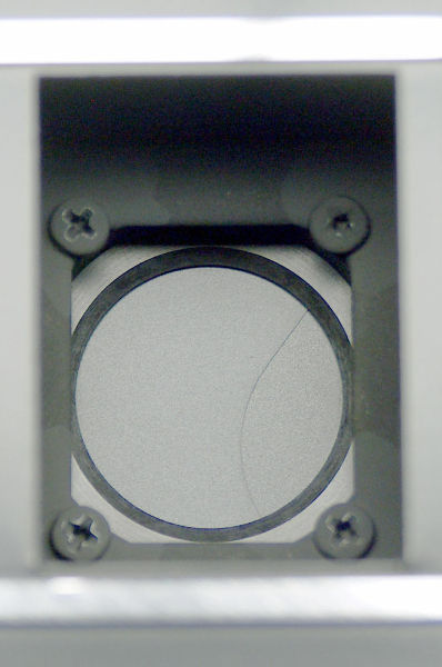 | On the Trip, in order to remove the front assembly, you removed four screws on the large shutter-plate. But on the Pen, with the back off or open, you'll see four screws as shown around the shutter-blades. Unscrew them, and the front assembly comes off. |