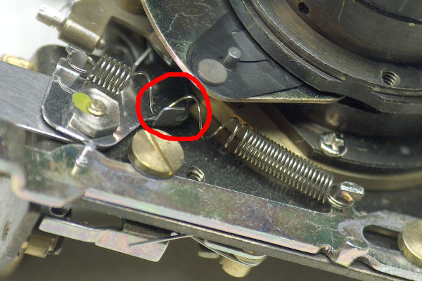 | Remember the three springs on the front of the Trip's shutter-plate? You have the same springs in the Pen. Remove them. And attach the longest spring as shown. Note that I stretched this spring so as to avoid a tab (circled in red) that was interfering with the spring. If you don't want to stretch the spring for some reason, you can bend the tab over or cut it off. |